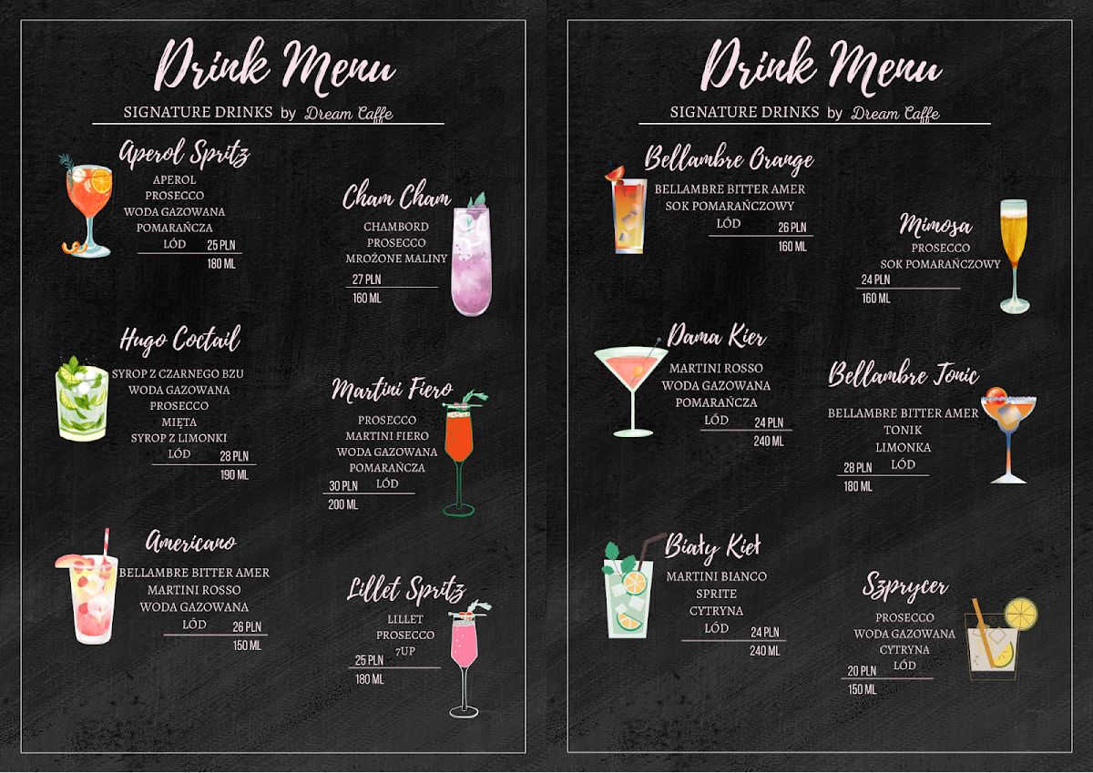 Aperol Spritz - Cham Cham - Hugo Coctail - Martini Fiero - Americano - Lillet Spritz - Bellambre Orange - Mimosa - Dama Kier - Bellambre Tonic - Biały Kieł - Szprycer
